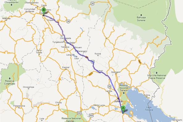 Saindo de Puno, às margens do Lago Titicaca – parte peruana – basta seguir a Ruta 3S até Cuzco que não tem erro. Mas quando chegar na cidade, terá que atravessá-la inteira e para isso é necessário muita paciência... o trânsito é meio caótico (não como na Bolívia) mas sem GPS, fica difícil se guiar pelas placas.